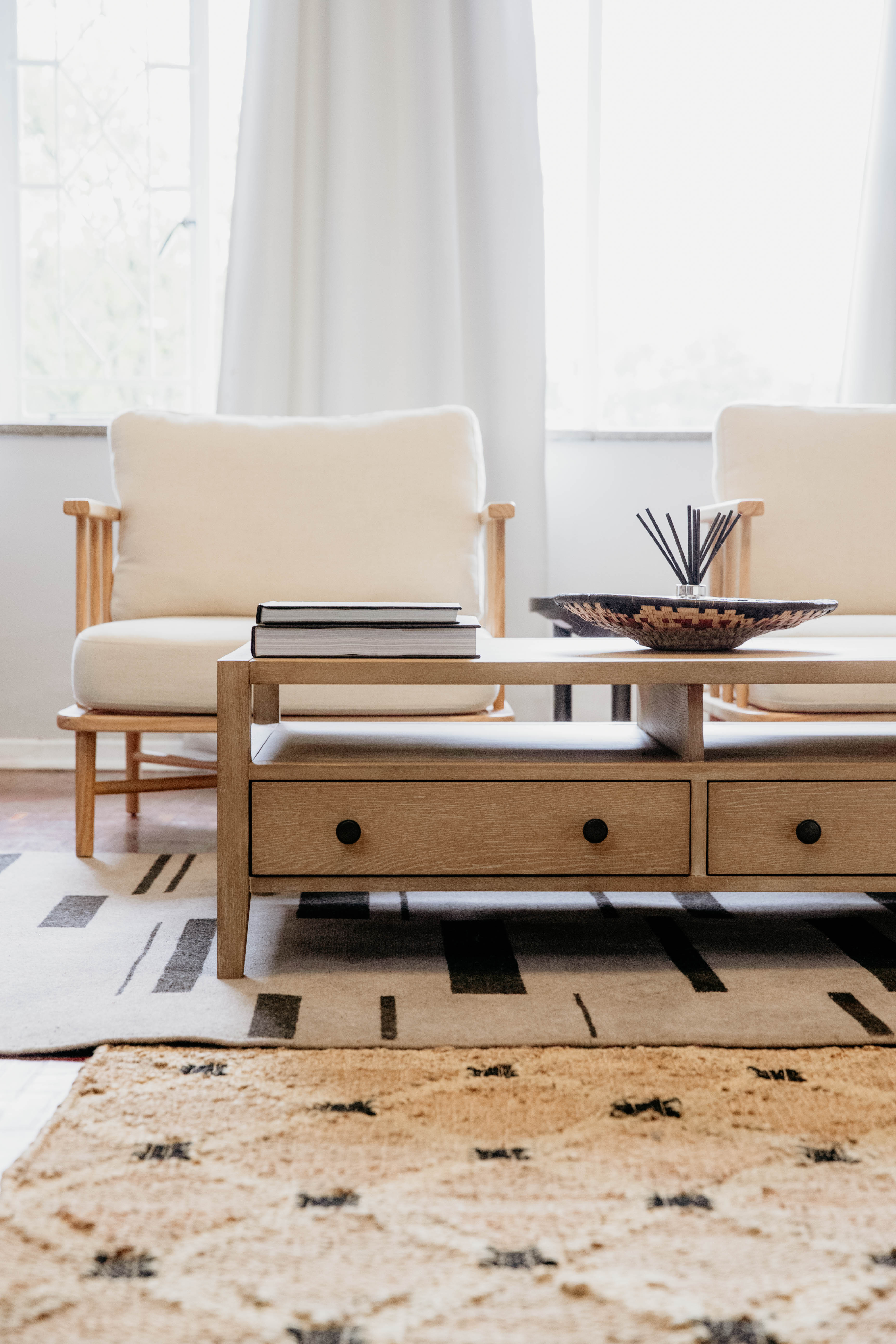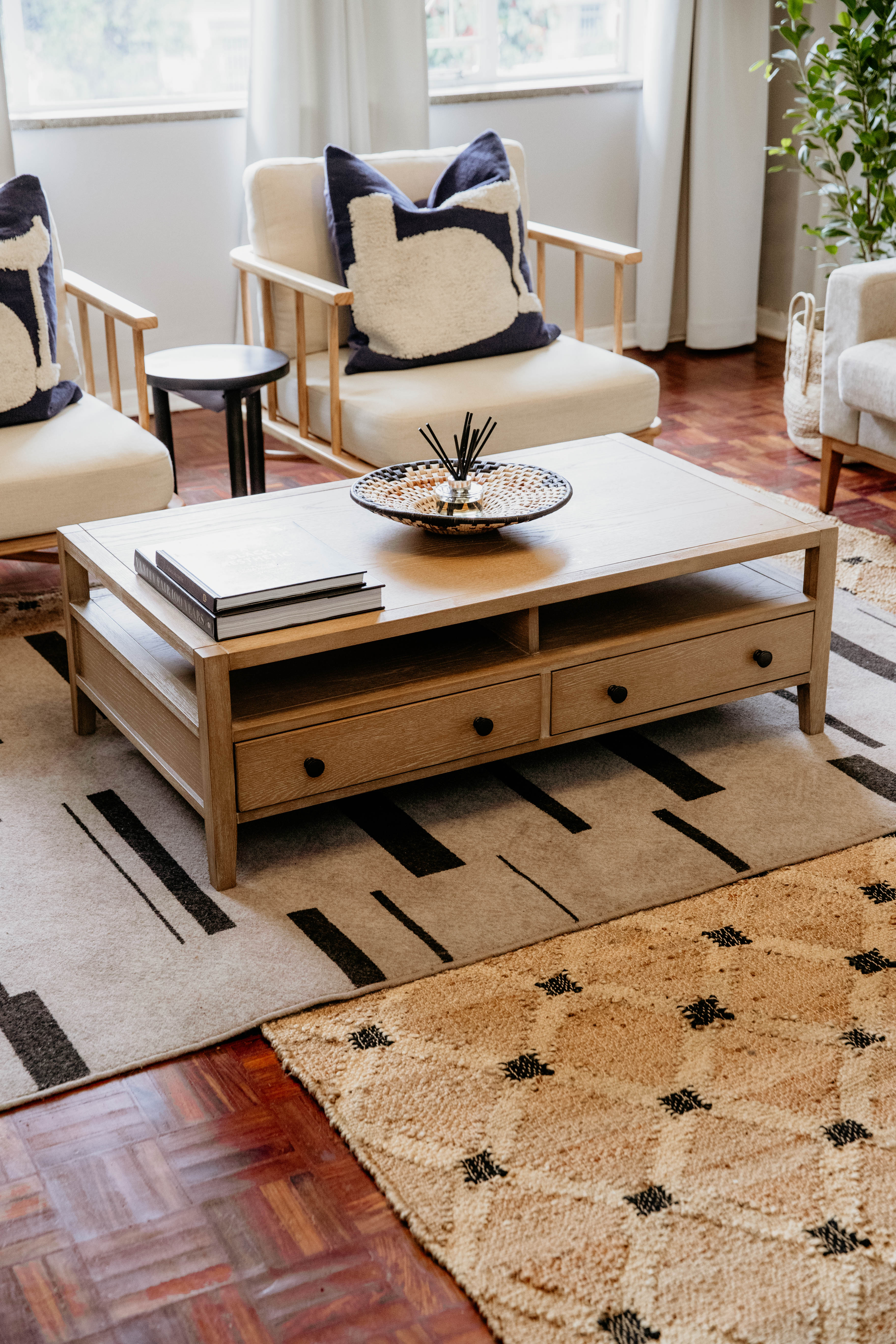 Layering creates depth. For example, when you cook, you layer different flavours to create depth of flavour. My rugs having completely different textures and geometric designs, together, add a welcomed depth in the lounge.