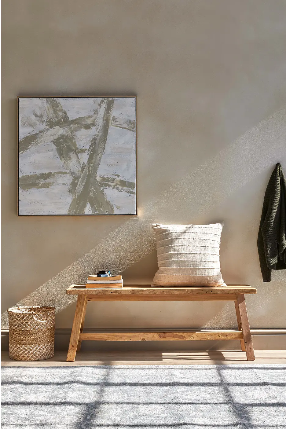 A bench in an entrance hall provides a convenient spot to sit while putting on or taking off shoes and offers a welcoming touch for guests. You can also use it to display décor or store throws.