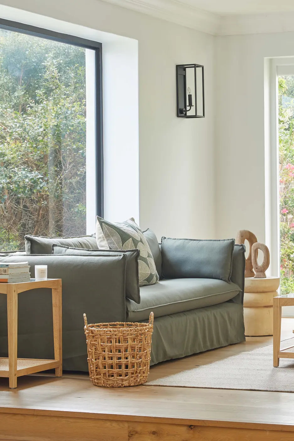 Understanding where your couch will live will make it easier to place. For example, if your space has curved walls, placing a couch with a straight frame against the wall will feel abrupt. However, keeping it away from the wall can create intentional space around the couch.